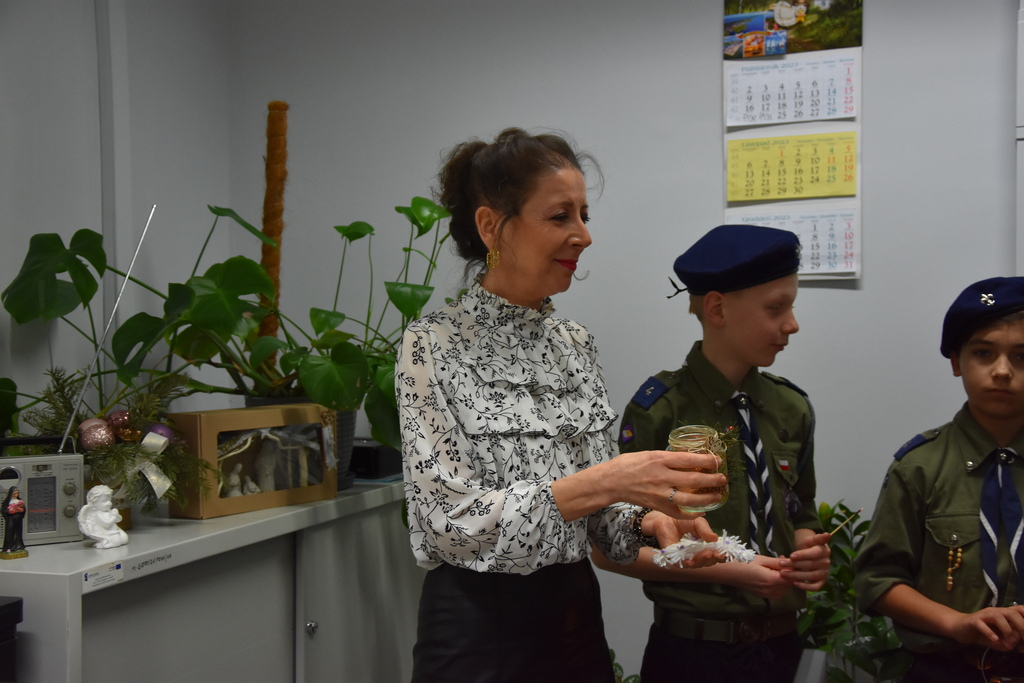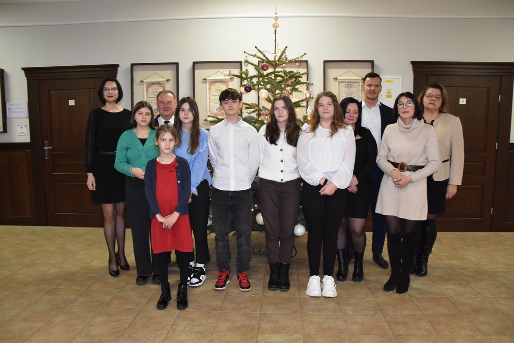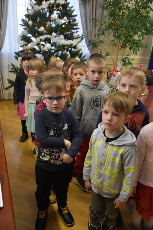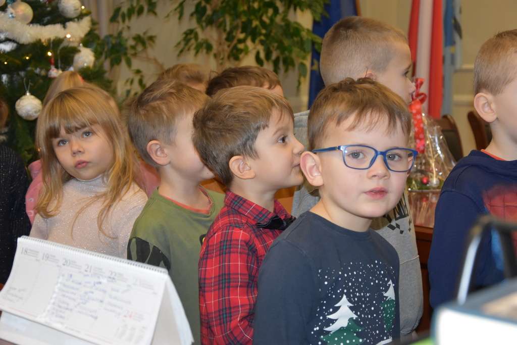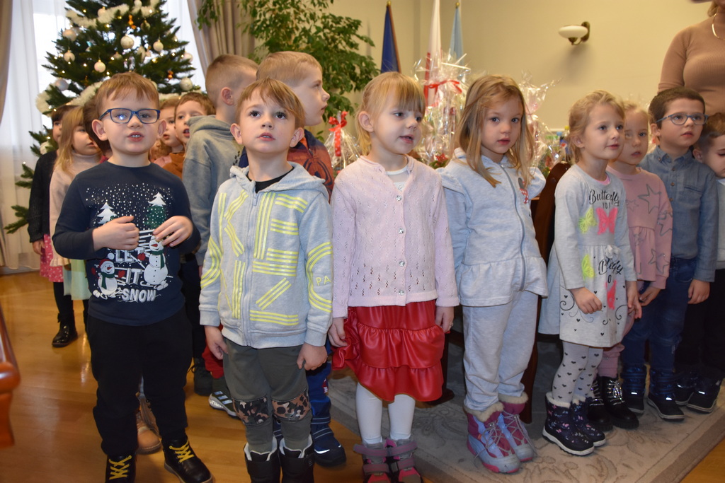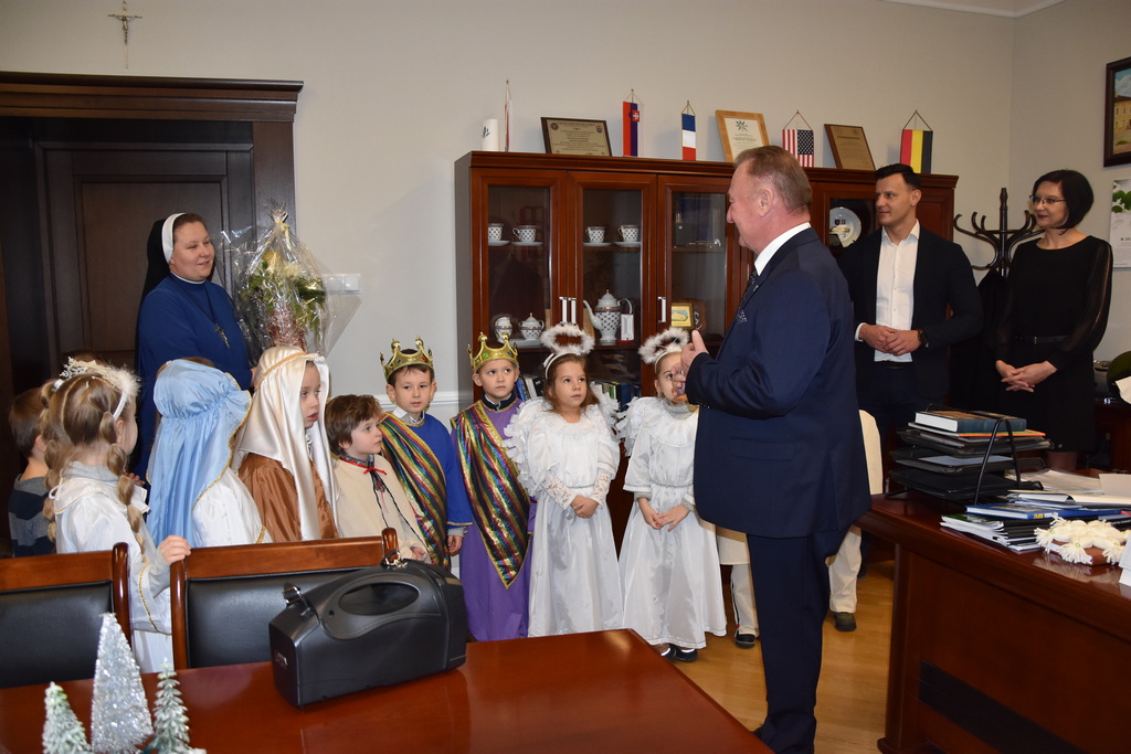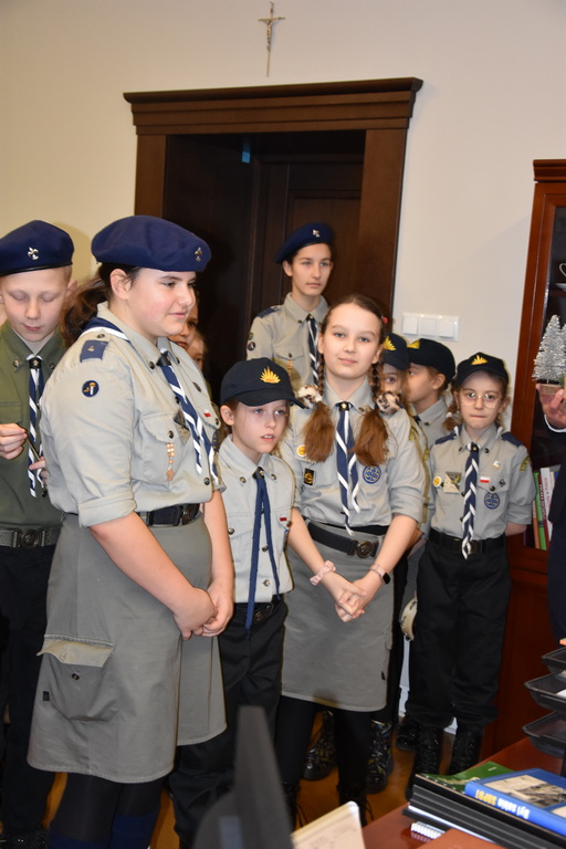 Z życzeniami świątecznymi, kolędą i pięknymi upominkami 20 grudnia 2023 r. przybyli do Urzędu Miasta i Gminy w Sieniawie wyjątkowi goście - dzieci z placówek oświatowych z terenu Miasta i Gminy Sieniawa, harcerze z 4. DH "Sokoły" - którzy przynieśli Betlejemskie Światło Pokoju, uczestnicy Środowiskowego Domu Samopomocy w Sieniawie z opiekunami oraz panie dyrektorki ze szkół podstawowych i miejskiego przedszkola. Spotkał się z nimi Burmistrz Miasta i Gminy Sieniawa Adam Woś wraz ze współpracownikami.