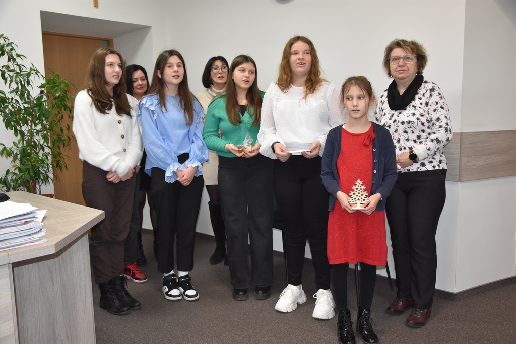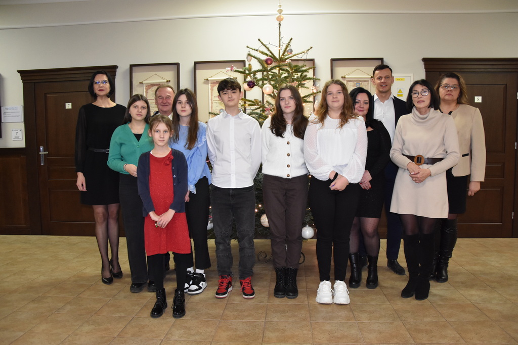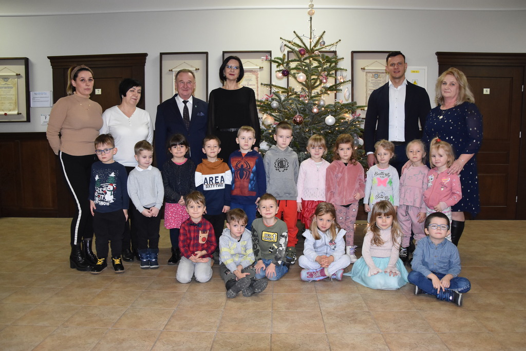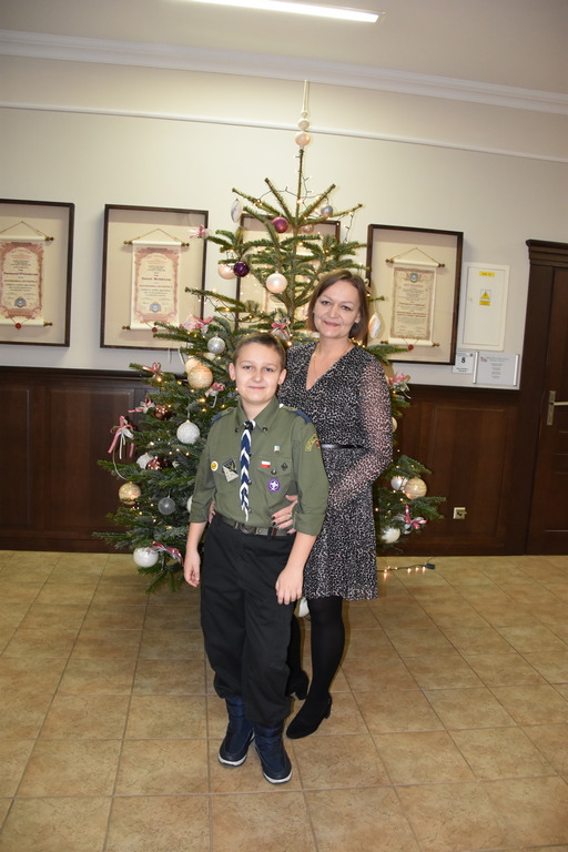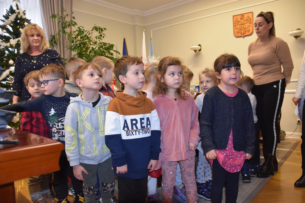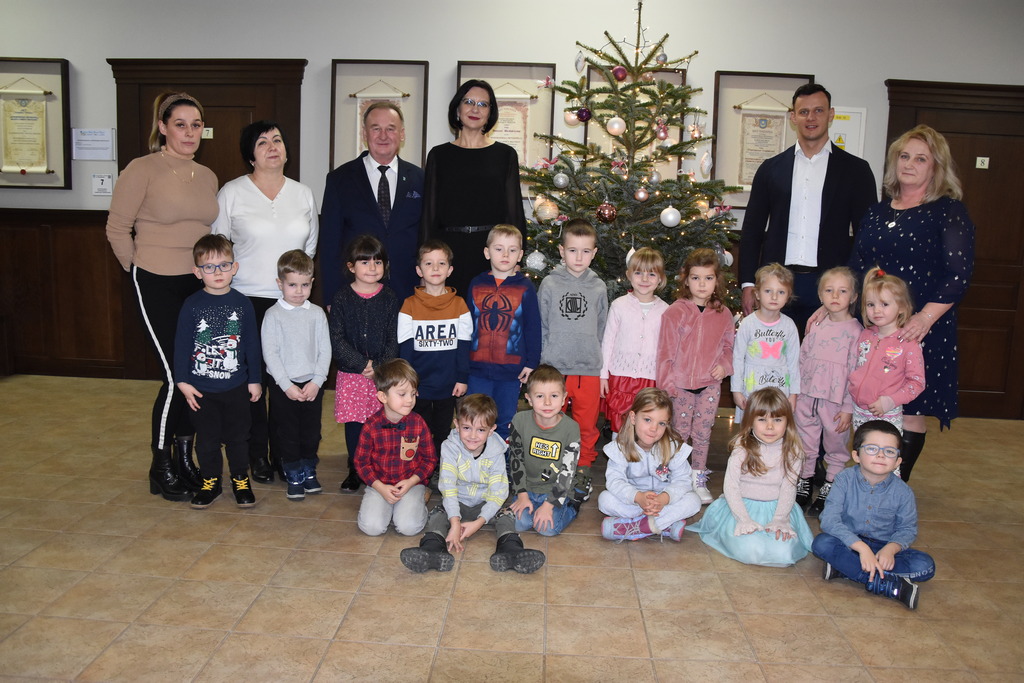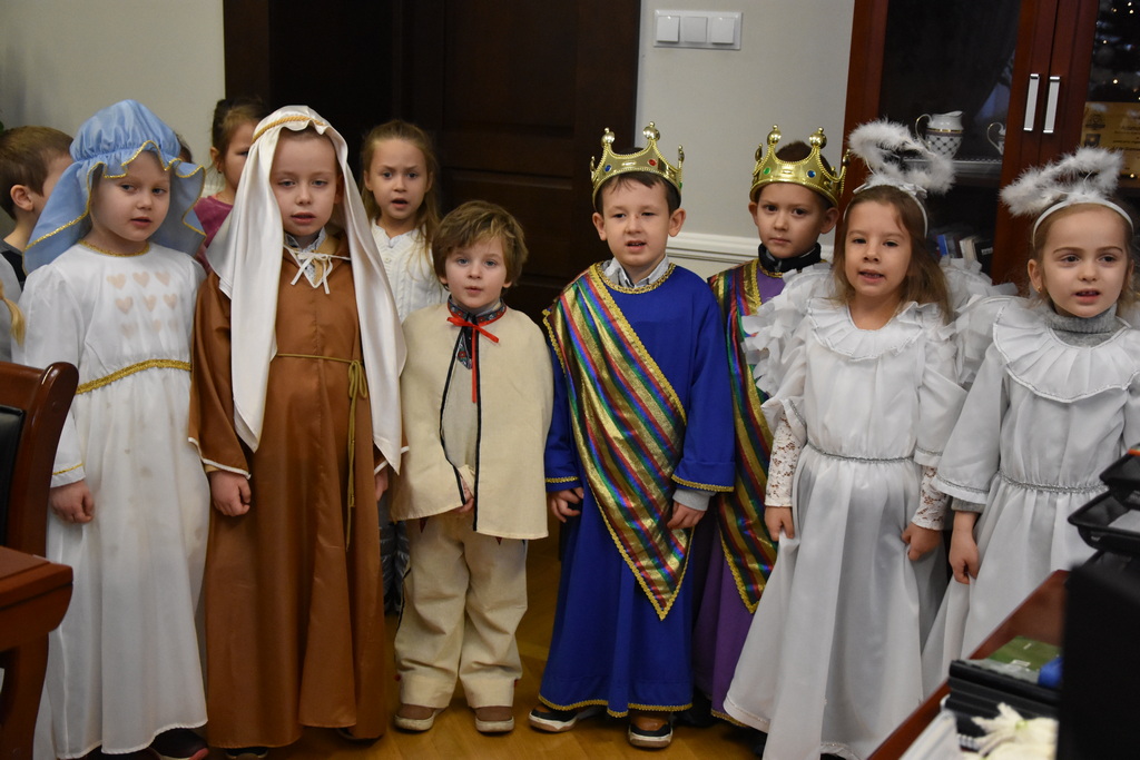 Z życzeniami świątecznymi, kolędą i pięknymi upominkami 20 grudnia 2023 r. przybyli do Urzędu Miasta i Gminy w Sieniawie wyjątkowi goście - dzieci z placówek oświatowych z terenu Miasta i Gminy Sieniawa, harcerze z 4. DH "Sokoły" - którzy przynieśli Betlejemskie Światło Pokoju, uczestnicy Środowiskowego Domu Samopomocy w Sieniawie z opiekunami oraz panie dyrektorki ze szkół podstawowych i miejskiego przedszkola. Spotkał się z nimi Burmistrz Miasta i Gminy Sieniawa Adam Woś wraz ze współpracownikami.