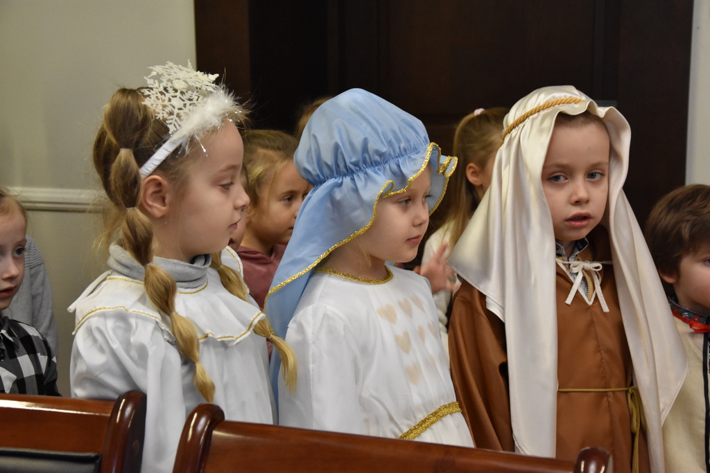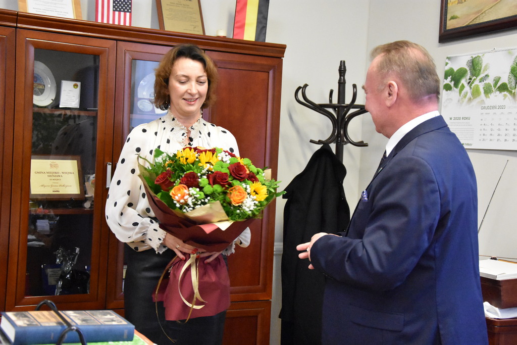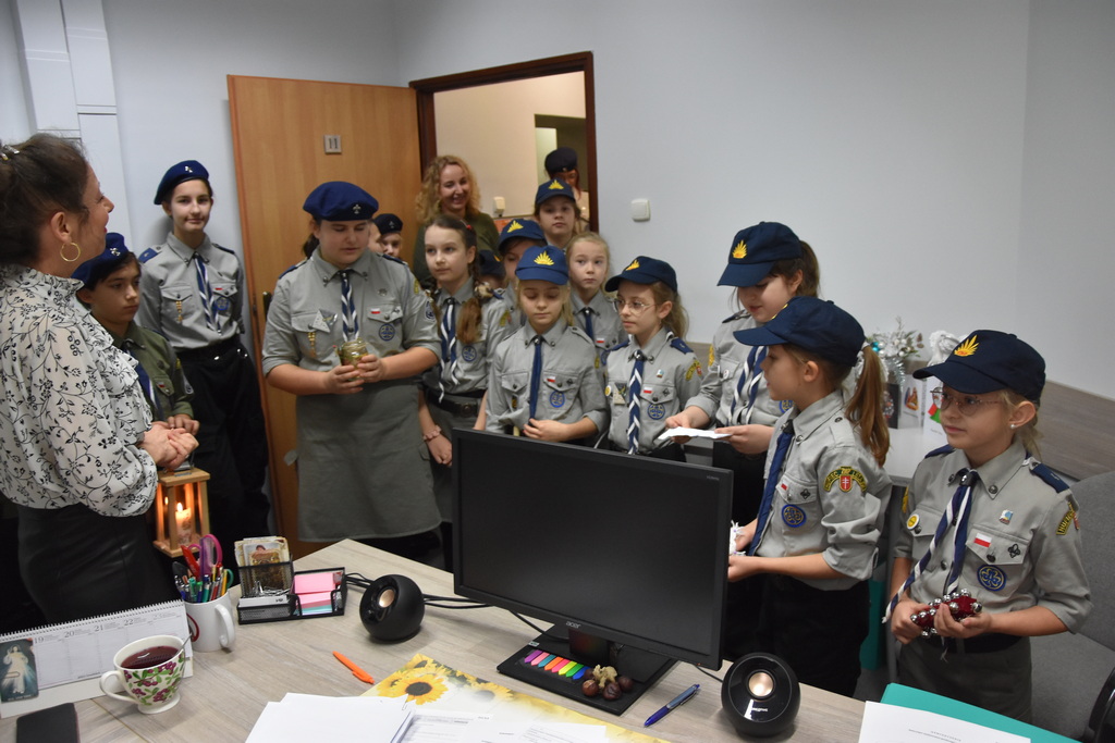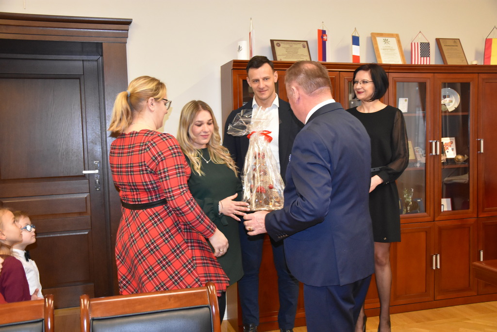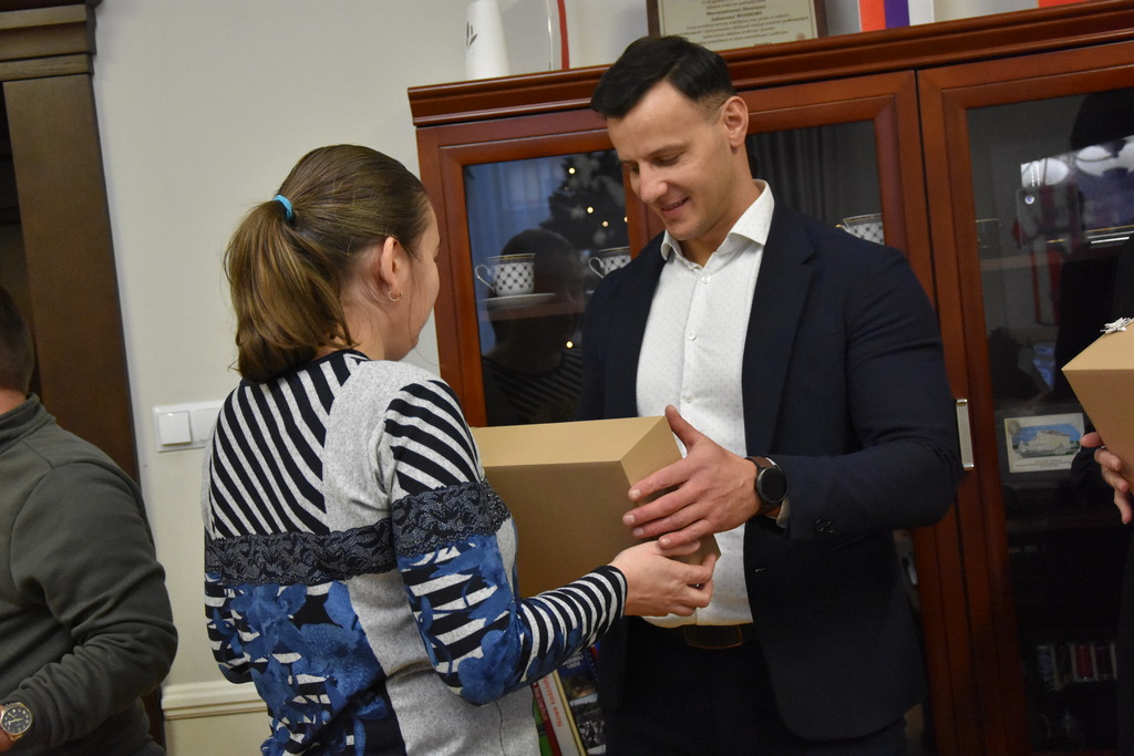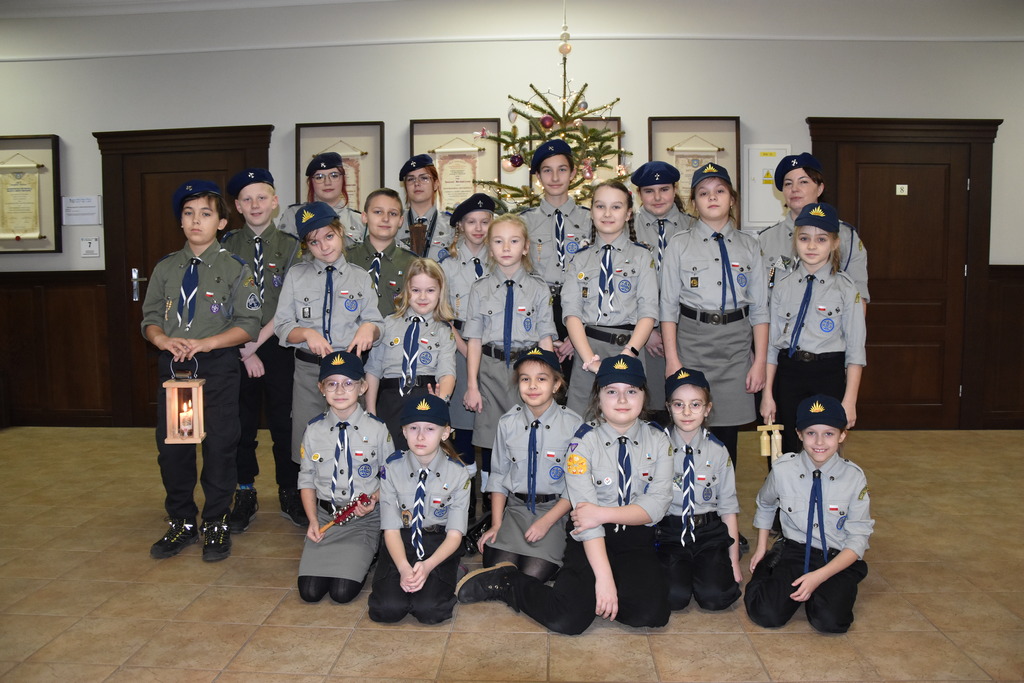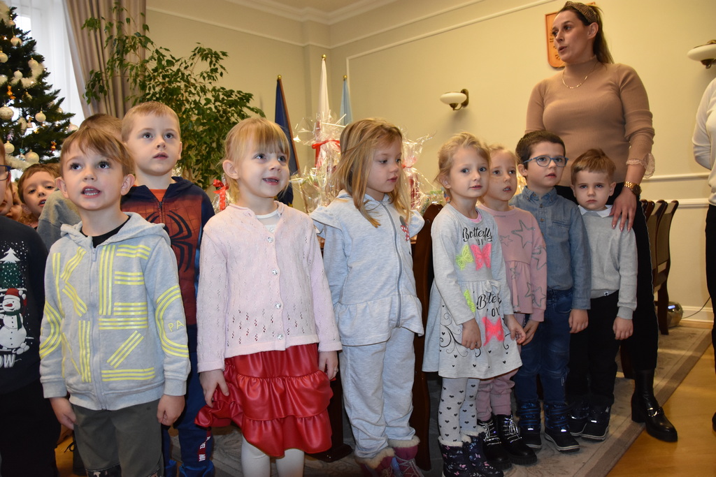 Z życzeniami świątecznymi, kolędą i pięknymi upominkami 20 grudnia 2023 r. przybyli do Urzędu Miasta i Gminy w Sieniawie wyjątkowi goście - dzieci z placówek oświatowych z terenu Miasta i Gminy Sieniawa, harcerze z 4. DH "Sokoły" - którzy przynieśli Betlejemskie Światło Pokoju, uczestnicy Środowiskowego Domu Samopomocy w Sieniawie z opiekunami oraz panie dyrektorki ze szkół podstawowych i miejskiego przedszkola. Spotkał się z nimi Burmistrz Miasta i Gminy Sieniawa Adam Woś wraz ze współpracownikami.