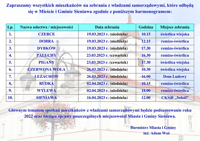 Zapraszamy wszystkich mieszkańców na zebrania z władzami samorządowymi, które odbędą się w Mieście i Gminie Sieniawa zgodnie z harmonogramem.