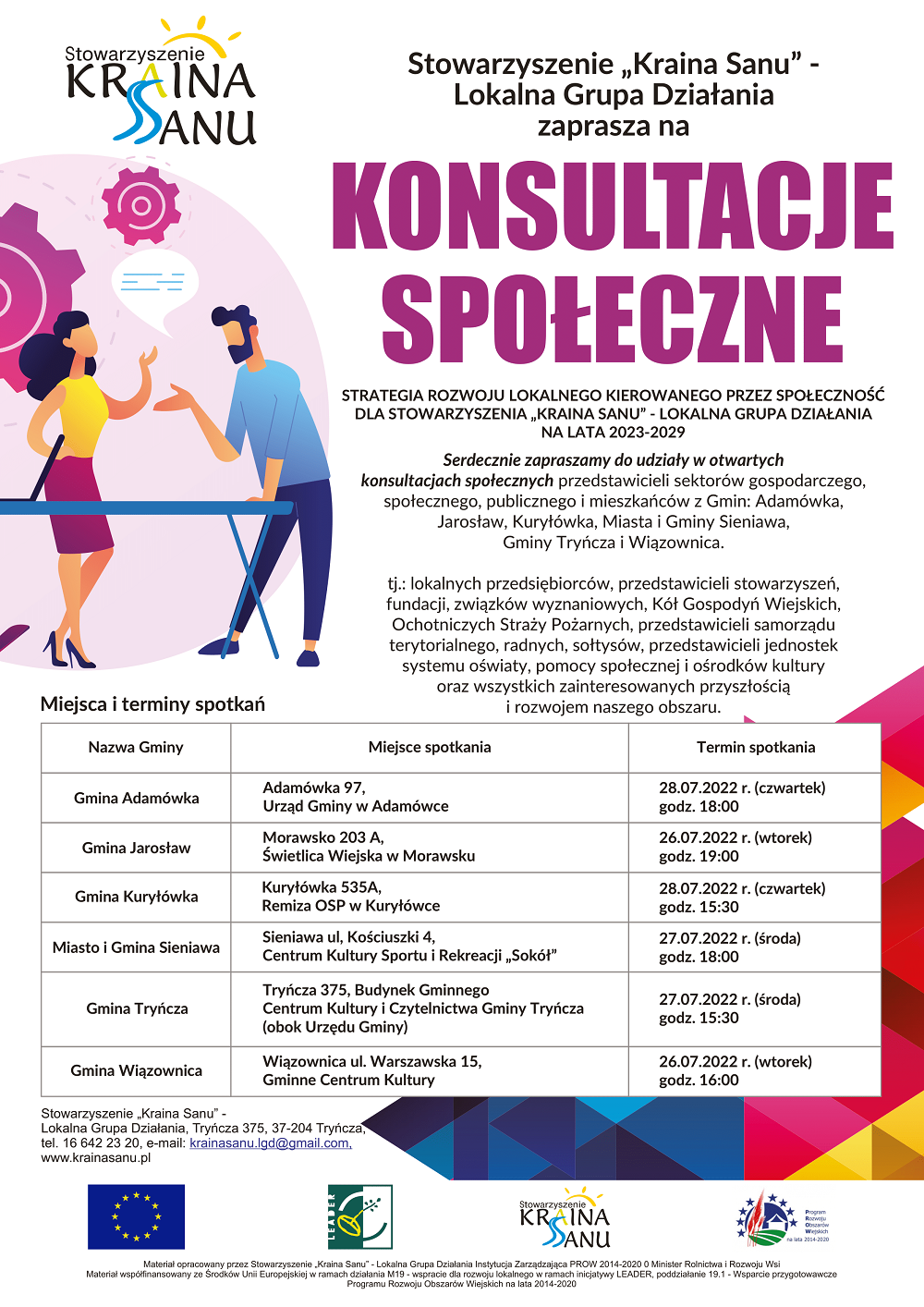 Stowarzyszenie Kraina Sanu - Lokalna Grupa Działania zaprasza do udziału w konsultacjach społecznych do LSR na lata 2023-2029. Spotkanie w Sieniawie odbędzie się 27 lipca 2022 r. (środa) o godz. 18.00 w sali widowiskowej Centrum Kultury, Sportu i Rekreacji "Sokół". Szczegóły na plakacie.