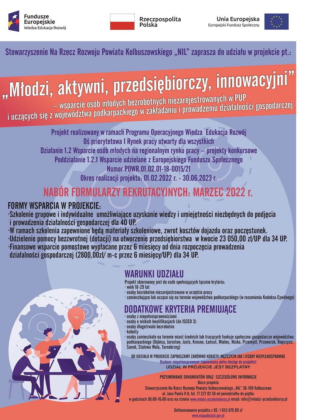 Stowarzyszenie Na Rzecz Rozwoju Powiatu Kolbuszowskiego „NIL” 36-100 Kolbuszowa ul. Jana Pawła II 8; tel. 17 227 02 58 od poniedziałku do piątku w godzinach 08:00-16:00 oraz na stronie www.mlodzi-przedsiebiorcy.pl email: info@mlodzi-przedsiebiorcy.pl oraz na spotkaniach informacyjnych: