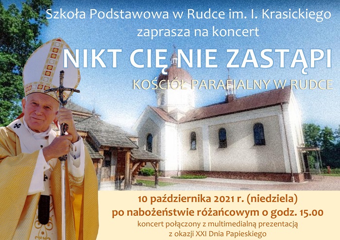 Wszystkich, którym bliska jest postać Jana Pawła II, Szkoła Podstawowa w Rudce zaprasza na koncert "Nikt Cię nie zastąpi" połączony z multimedialną prezentacją z okazji XXI Dnia Papieskiego. Wydarzenie odbędzie się w niedzielę, 10 października 2021 r. w kościele parafialnym w Rudce po nabożeństwie różańcowym o godz. 15.00.
