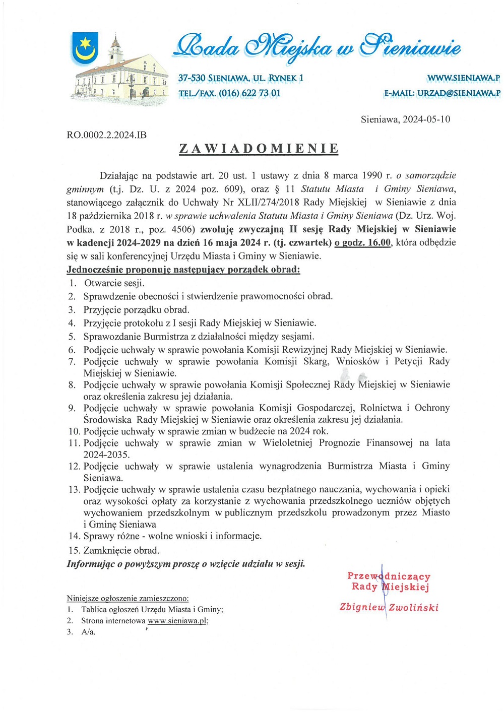 Zawiadomienie o zwołaniu II sesji Rady Miejskiej w Sieniawie w dniu 16 maja 2024 r.