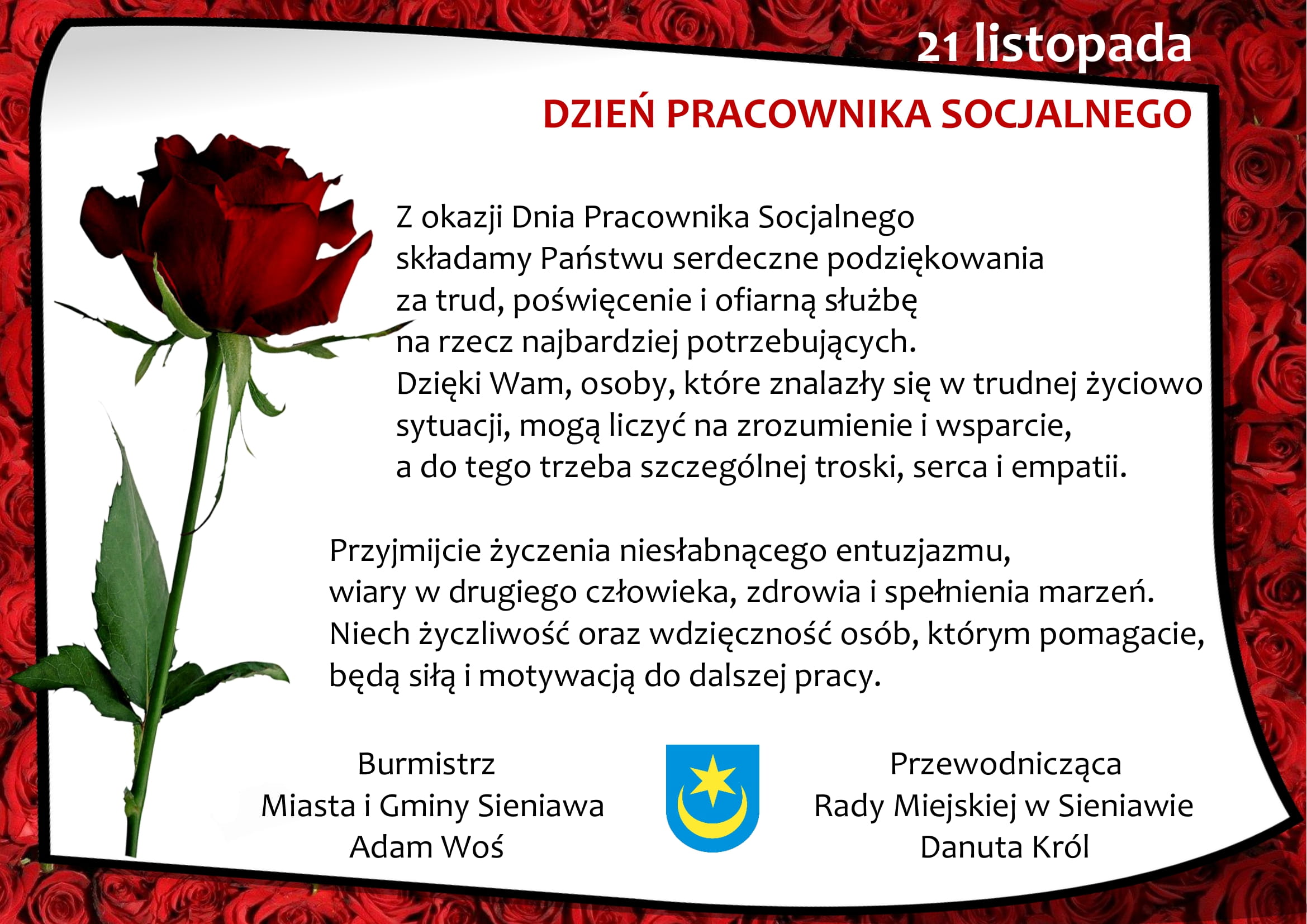 Z okazji Dnia Pracownika Socjalnego wszystkim pracownikom służb społecznych w szczególności Miejsko-Gminnego Ośrodka Pomocy Społecznej i Środowiskowego Domu Samopomocy w Sieniawie, składamy najserdeczniejsze życzenia.